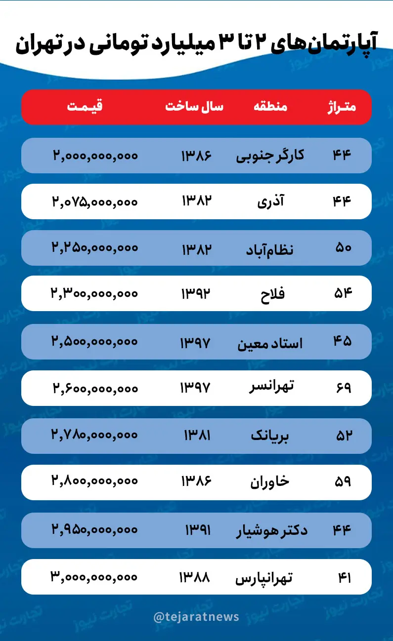 بررسی آگهیهای آپارتمان در مناطق مختلف تهران نشان میدهد، خانههاییبا قیمت دو تا سه میلیارد تومان، غالبا متراژی بین ۴۰ تا ۵۵ متر دارند. همچنین این واحدها بیشتر در محدوده شرق، جنوب غربی و جنوب تهران واقع شدهاند.