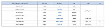 - کلیه قیمتهای مندرج در جدول، قیمت در مبادی ورودی کشور بوده و هزینههای بعد از ترخیص شامل بیمه شخص ثالث، شمارهگذاری، مالیات بر ارزش افزوده، عوارض قانونی، اسقاط خودروی فرسوده، کرایه حمل موارد دیگر به قیمتهای مذکور اضافه میشود.