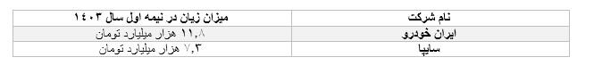 در این وضعیت اما دو شرکت بزرگ خودروسازی در ایران یعنی سایپا و ایران خودرو زیان تولید کردهاند. براساس صورتهای مالی حسابرسی نشده، ایرانخودرو و سایپا در ۶ ماه نخست سال مجموعاً ۱۹.۱ هزار میلیارد تومان زیان خالص ساختند. در تهیه جدول فوق از اطلاعات پدال نیوز استفاده شده است.