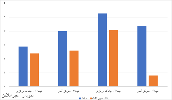 با وجود اختلافات محسوسی که میان ارقام محاسباتی دو مرجع رسمی وجود دارد، برخی روندهای مشترک میان آنها هم مشهود است. نقش رشد نفت هم عاملی غیرقابل چشمپوشی نیست و همزمان کاهش رشد آن، به نحوی که نرخ رشد نفت هم در گزارش مرکز آمار و هم در گزارش بانک مرکزی نصف مدت زمان مشابه در سال گذشته شده است.