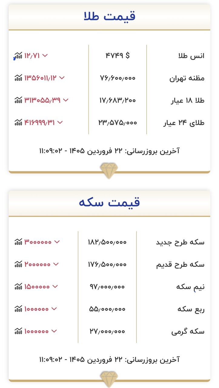 قیمت جدید طلا و سکه در اولین روز چهارمین هفته از فروردینماه ۱۴۰۵ اعلام شد.