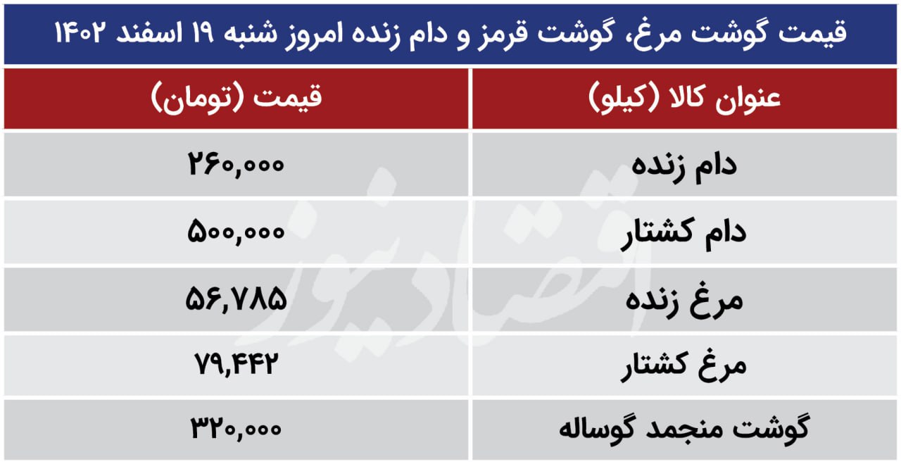 براساس اعلام پایگاه خبری صنعت مرغداری و دامپروری، امروز قیمت دام زنده کیلویی ۲۶۰ هزار تومان است؛ همچنین قیمت هر کیلو دام در کشتارگاه هم ۵۰۰ هزار تومان است.