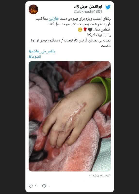خوش‌نژاد شب گذشته با انتشار تصویری از دست مجروح آرتین نوشته بود که بناست هفته آینده دست او دوباره جراحی شود.