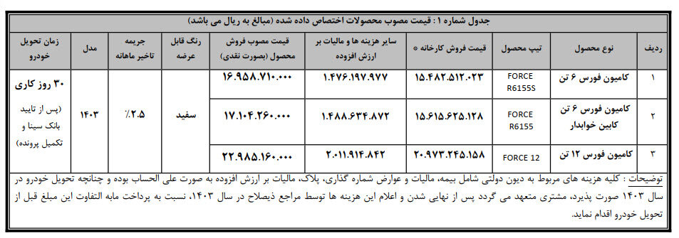 بهمن نیوز نوشت: بهمن دیزل کامیون فورس ۶ تن و ۱۲تن را در اقساط ۱۲ تا ۶۰ ماهه به فروش میرساند. از دیگر شرایط ویژه این طرح، تنفس دو ماهه شروع اقساط و تحویل فوری محصول به خریداران است. همچنین نرخ سود تسهیلات این طرح ۲۳ درصد است که در قالب اقساط ۱۲، ۲۴، ۳۶، ۴۸ و ۶۰ ماهه عرضه میشود.