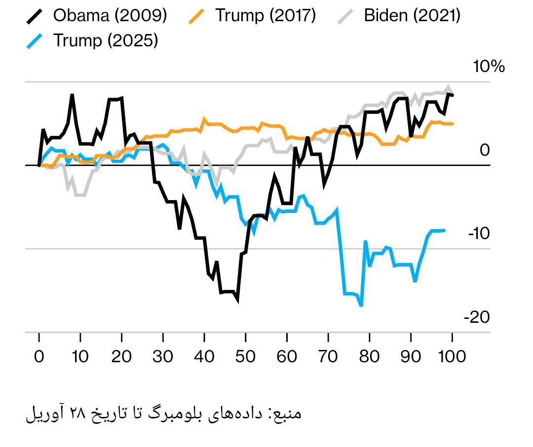بلومبرگ نوشت: زمانی که به دادههای نرم توجه میکنیم، تصویر به طور قابل توجهی متفاوت است. نظرسنجیهای مربوط به اعتماد مصرفکننده، برنامههای سرمایهگذاری شرکتها و انتظارات برای رشد و اشتغال همگی کاهش یافتهاند و دلیل اصلی این وضعیت، جنگ تجاری ترامپ است. اعمال بینظم بالاترین تعرفههای ایالات متحده در بیش از یک قرن گذشته، عدم قطعیت را در سراسر اقتصاد گسترش داده است. این عدم قطعیت همچنین در بازارهای مالی نمایان شده است، به طوری که بدترین عملکرد بازار سهام و بزرگترین سقوط ارزش دلار در همان مرحله از هر دوره ریاستجمهوری اخیر مشاهده میشود. برای رایدهندگان آمریکایی، اعتماد به ترامپ به عنوان متولی اقتصاد، عامل اصلی پیروزی او در نوامبر گذشته بود و این اعتماد نیز تحت تأثیر قرار گرفته است.
