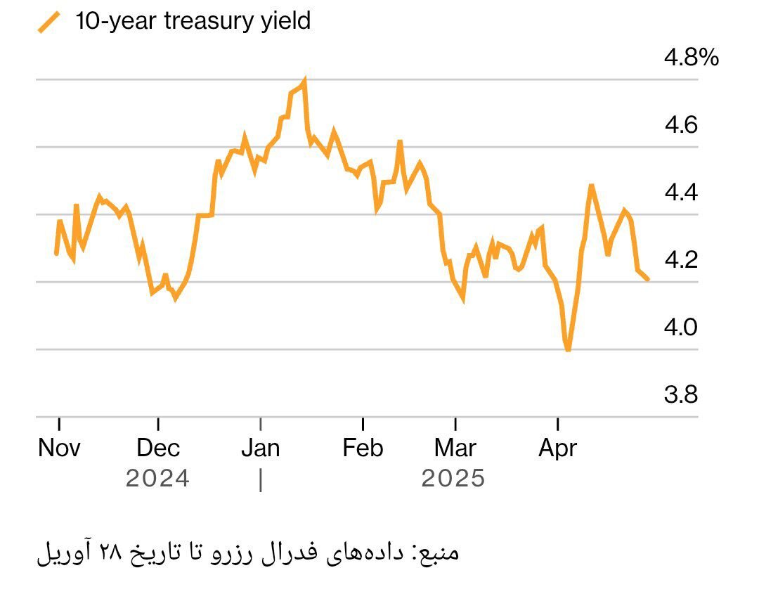 نرخ اوراق قرضه ده ساله خزانهداری در تاریخ دوم آوریل، همزمان با اعلام تعرفههای سنگین ترامپ، یکی از شدیدترین افزایشهای خود را تجربه کرد و نزدیک به ۴.۶ درصد بالا رفت. برخی از سرمایهگذاران این افزایش را نشانهای از کاهش اعتماد جهانی به داراییهای آمریکایی تلقی کردند. با این حال، از آن زمان به بعد، بازده این اوراق کاهش یافته و تقریباً به سطحی که در زمان انتخاب ترامپ بود، رسیده و به مراتب پایینتر از سطوحی است که در زمان آغاز ریاستجمهوری او مشاهده میشد.