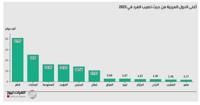 قطر با ۸۲ هزار دلار درآمد سرانه در صدر و مصر با ۳۷۷۰ دلار در آخرین جایگاه این رتبهبندی قرار گرفت.