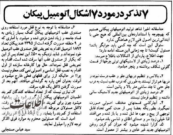 تولید خودروی پیکان در سالهای جنگ به دلیل تحریمهای شدید اقتصادی با نشیب و فرازهای فراوان روبرو بود. یک خواننده روزنامه اطلاعات با ارسال نامهای به روزنامه ایرادات فنی خودروهای پیکانی که در آن سال به مردم عرضه شده را شرح داده است. این نامه در روزنامه ۸ آذر ۱۳۶۲ منتشر شد. این نامه فنی را بخوانید و عکسی از خط تولید پیکان در سالهاس ابتدایی دهه ۱۳۶۰ در ایران خودرو را تماشا کنید.